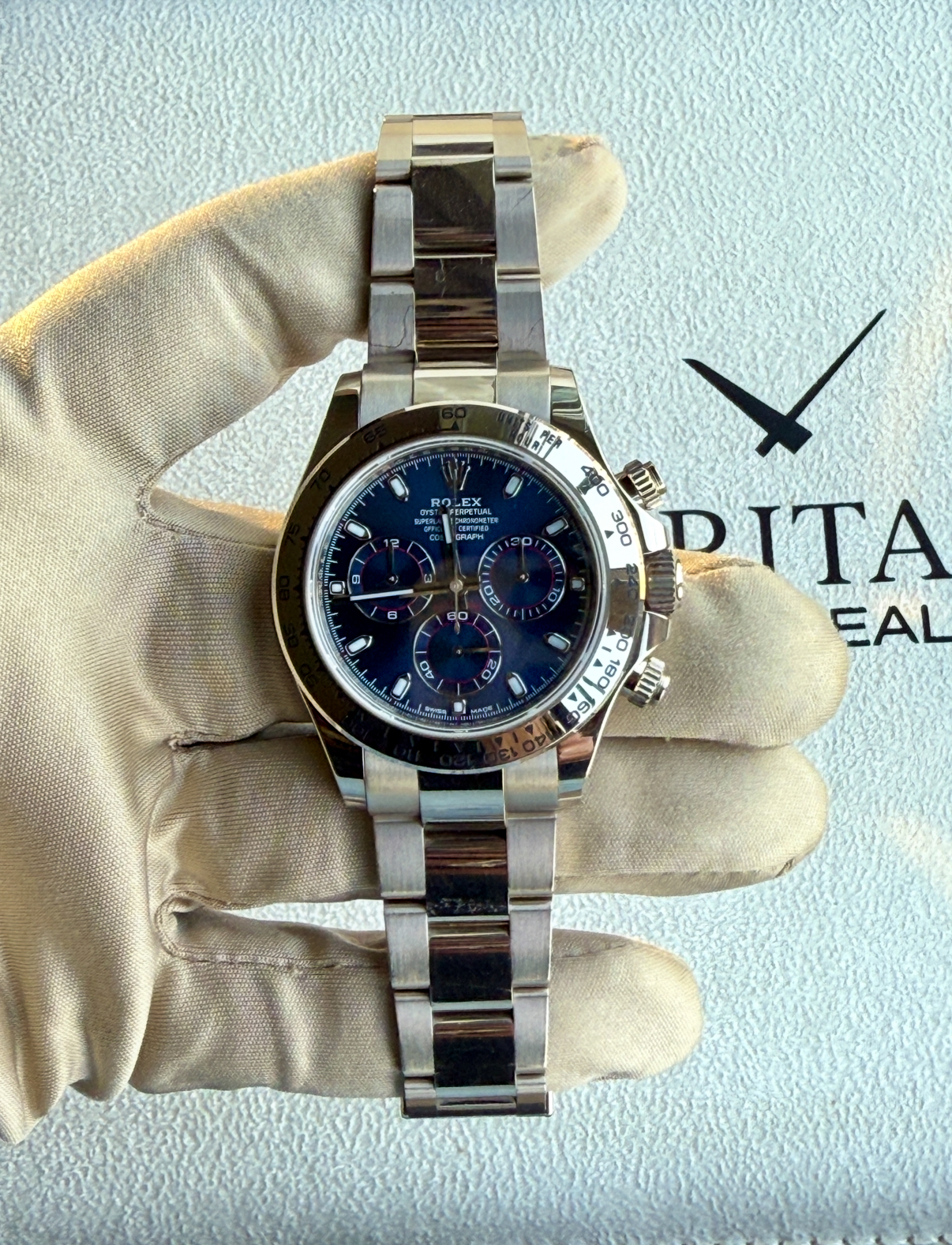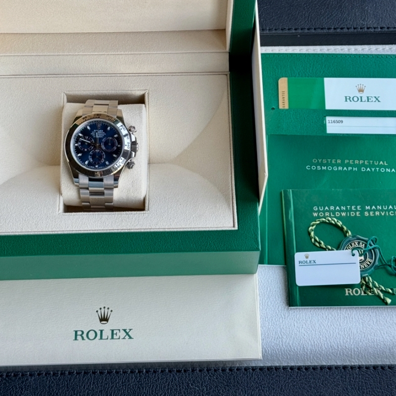 Rolex White Gold Daytona Blue Dial Box and Papers 116509