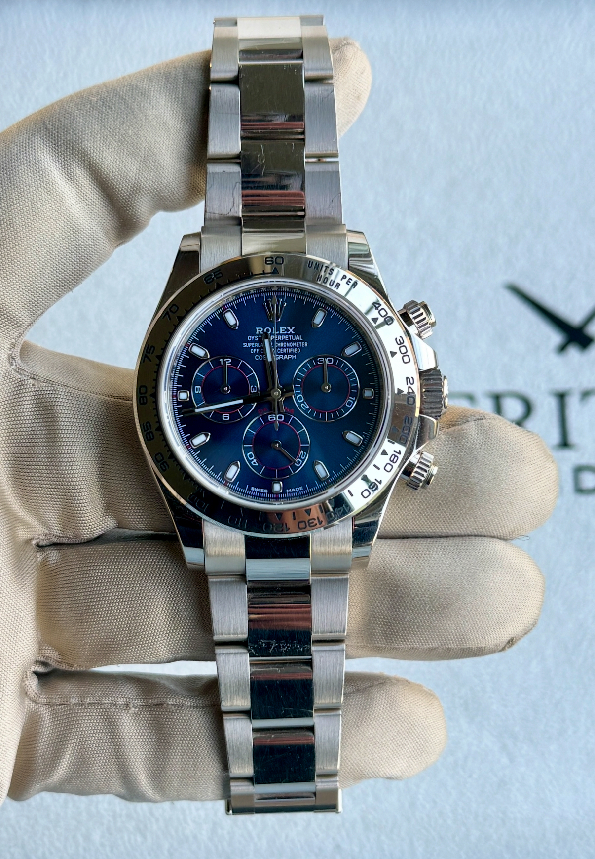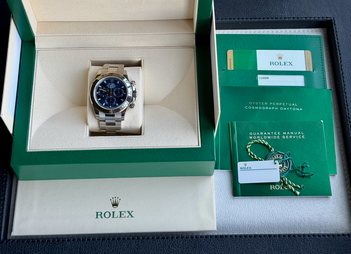 Rolex White Gold Daytona Blue Dial Box and Papers 116509